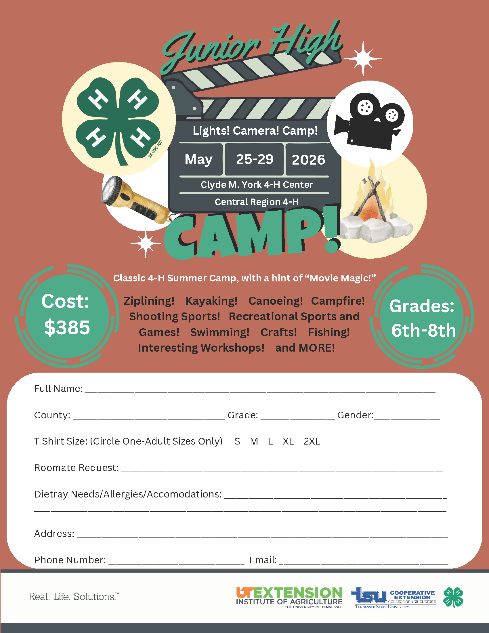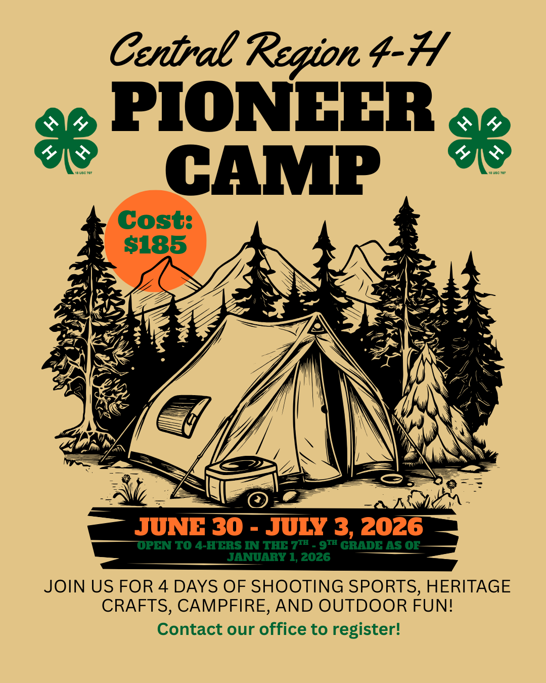 If you love being outdoors then this is the 4-H Camp for you! This rustic camp is for 7th-9th graders. See flyer below.