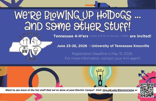 Electric Camp is a fun-filled, rewarding adventure in electricity traditionally held at the University of Tennessee, Knoxville. The camp features learning centers staffed by electric utility professionals. Each learning center will use hands-on activities that allow the 4-H members to learn by doing.
